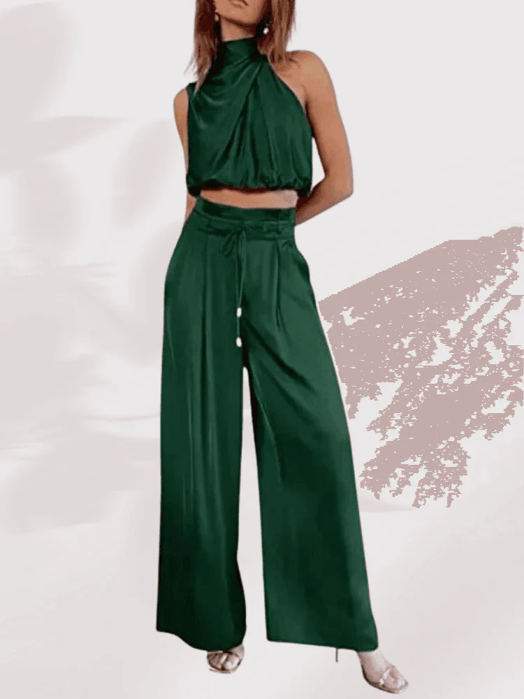 Este conjunto de dos piezas combina estilo y comodidad a la perfección. La blusa de diseño sin mangas presenta un cuello alto y un ajuste holgado que realza la figura de manera sofisticada. El pantalón de talle alto cuenta con un cinturón ajustable y un corte amplio que aporta fluidez y libertad de movimiento, ideal para cualquier ocasión, desde eventos formales hasta salidas casuales. Además, incluye bolsillos laterales para mayor funcionalidad.