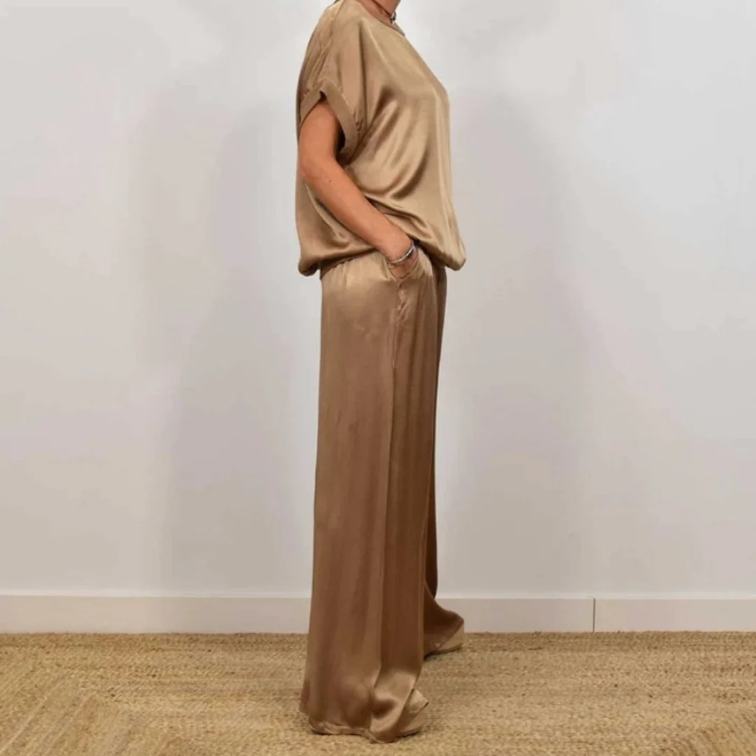Este conjunto de dos piezas es la definición perfecta de elegancia casual. Confeccionado en un tejido satinado de acabado suave y brillante, ofrece una caída fluida que se adapta al movimiento, logrando una silueta favorecedora y moderna.