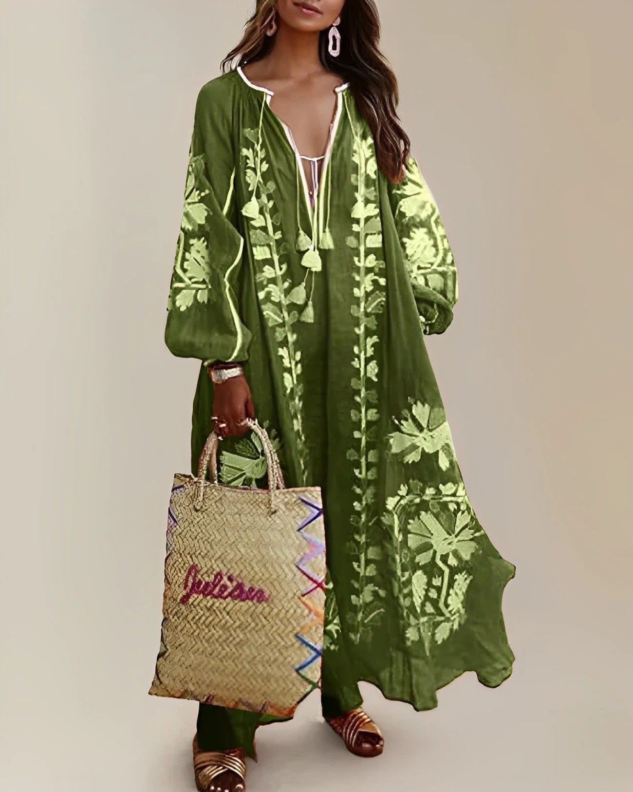 Luce un estilo libre y sofisticado con este vestido largo de inspiración bohemia, ideal para tus escapadas veraniegas o días relajados con estilo. Su diseño amplio y fluido proporciona una silueta cómoda y elegante, mientras que los detalles bordados a lo largo del vestido realzan su esencia artesanal.