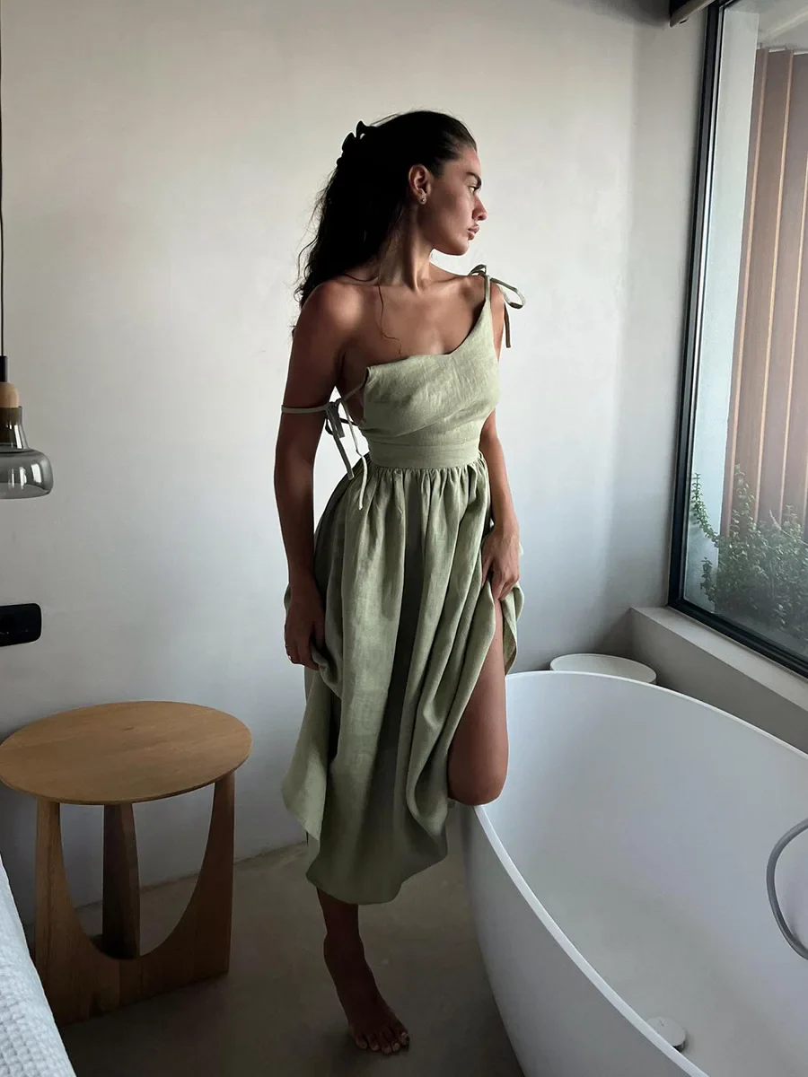 Este vestido midi de diseño asimétrico es la fusión perfecta entre estilo relajado y sofisticación. Confeccionado en una suave mezcla de algodón y lino, ofrece una textura natural y transpirable ideal para climas cálidos o escapadas veraniegas.
