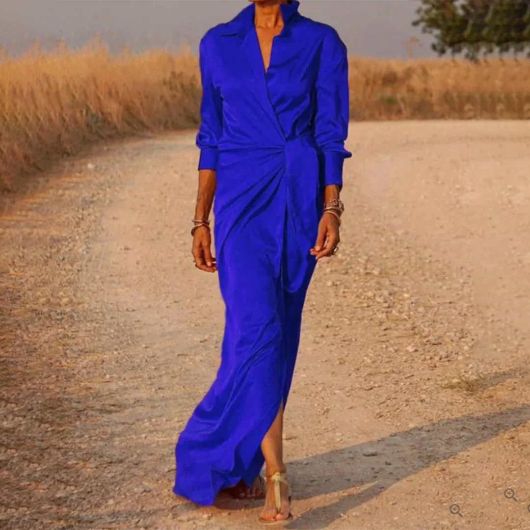 Este vestido largo combina elegancia y comodidad en una silueta fluida que estiliza la figura sin esfuerzo. Su diseño camisero con cuello clásico y mangas largas remangadas ofrece un aire sofisticado, ideal tanto para eventos formales como para ocasiones relajadas. El detalle anudado en la parte frontal realza la cintura y aporta un toque moderno al conjunto.