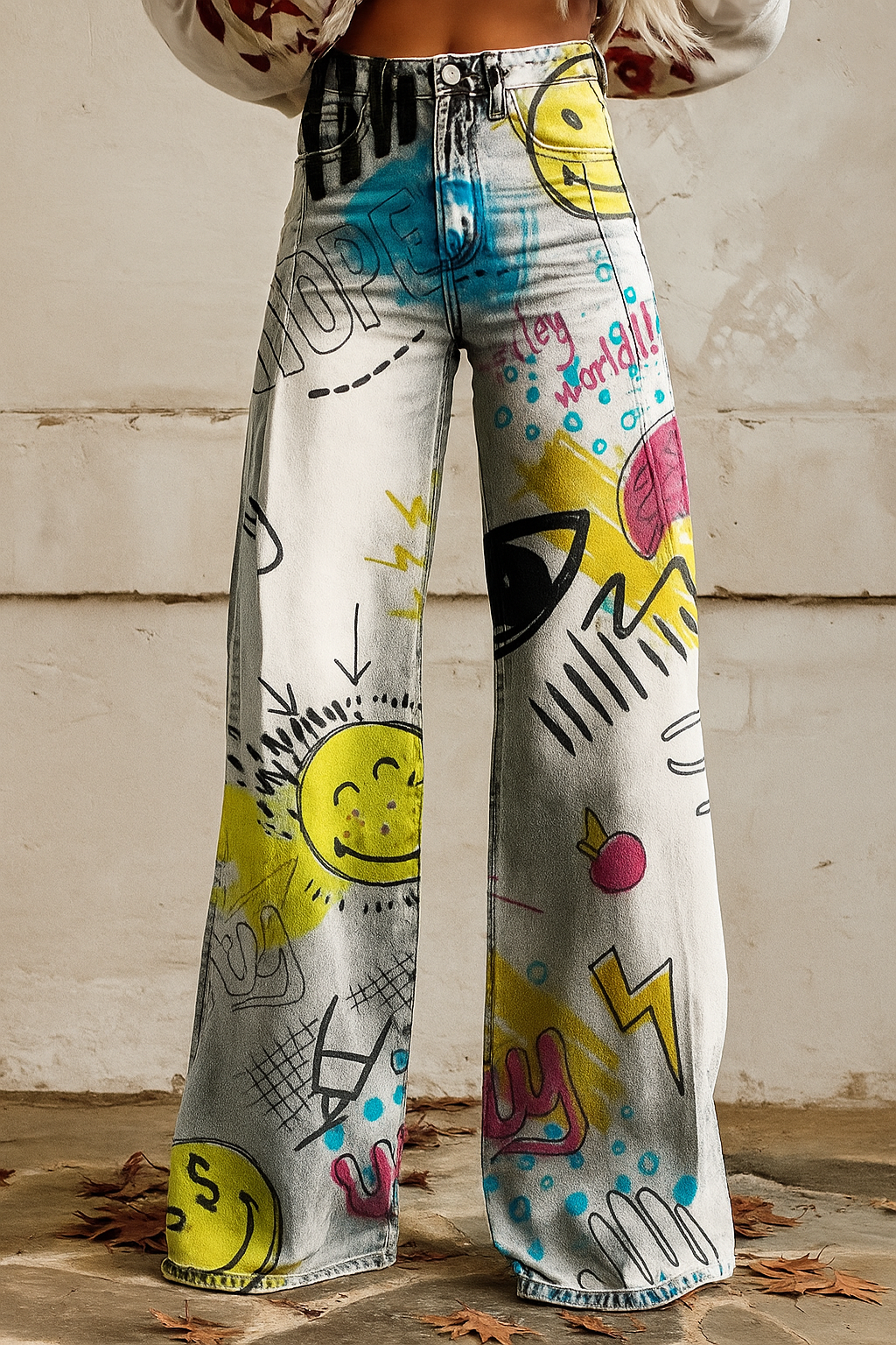 Dale un giro radical a tu estilo con este pantalón de mezclilla de pierna ancha con estampado tipo graffiti. Su diseño urbano y lleno de color lo convierte en la prenda ideal para quienes no tienen miedo de destacar. Con caritas felices, rayos, corazones y palabras manuscritas, cada detalle de este pantalón expresa creatividad, libertad y actitud.