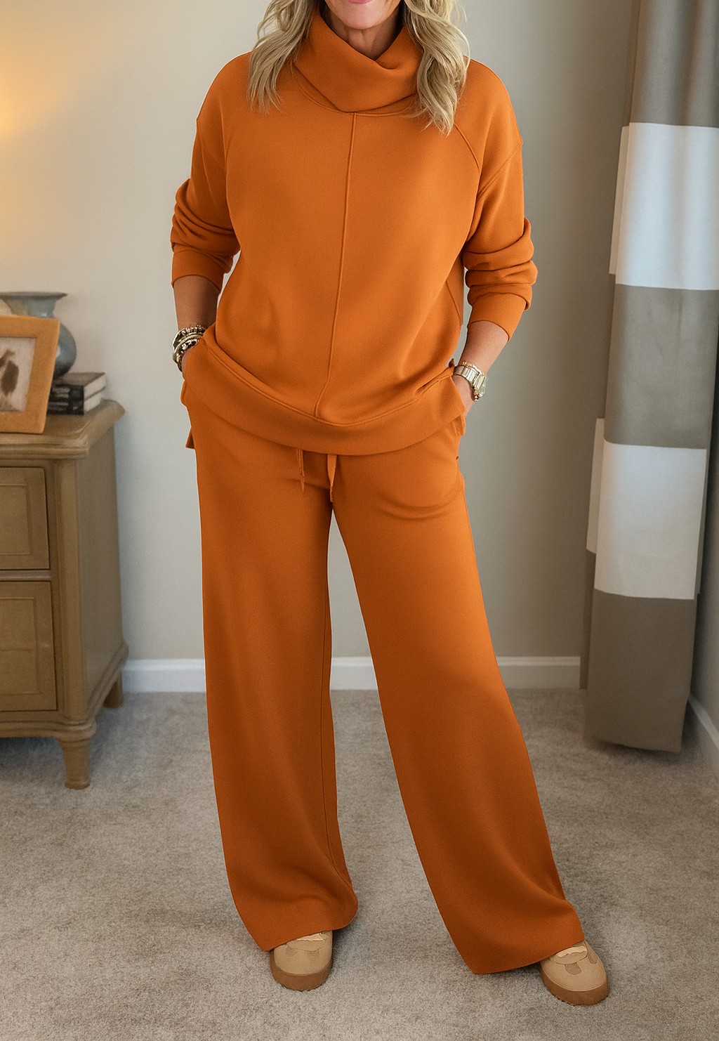 La parte superior presenta un cuello envolvente tipo chimenea, ideal para mantener el calor con estilo. Su diseño holgado y las costuras centrales dan un acabado pulido, mientras que los pantalones wide-leg aportan libertad de movimiento y una caída impecable. El tejido suave y cálido asegura confort durante todo el día.