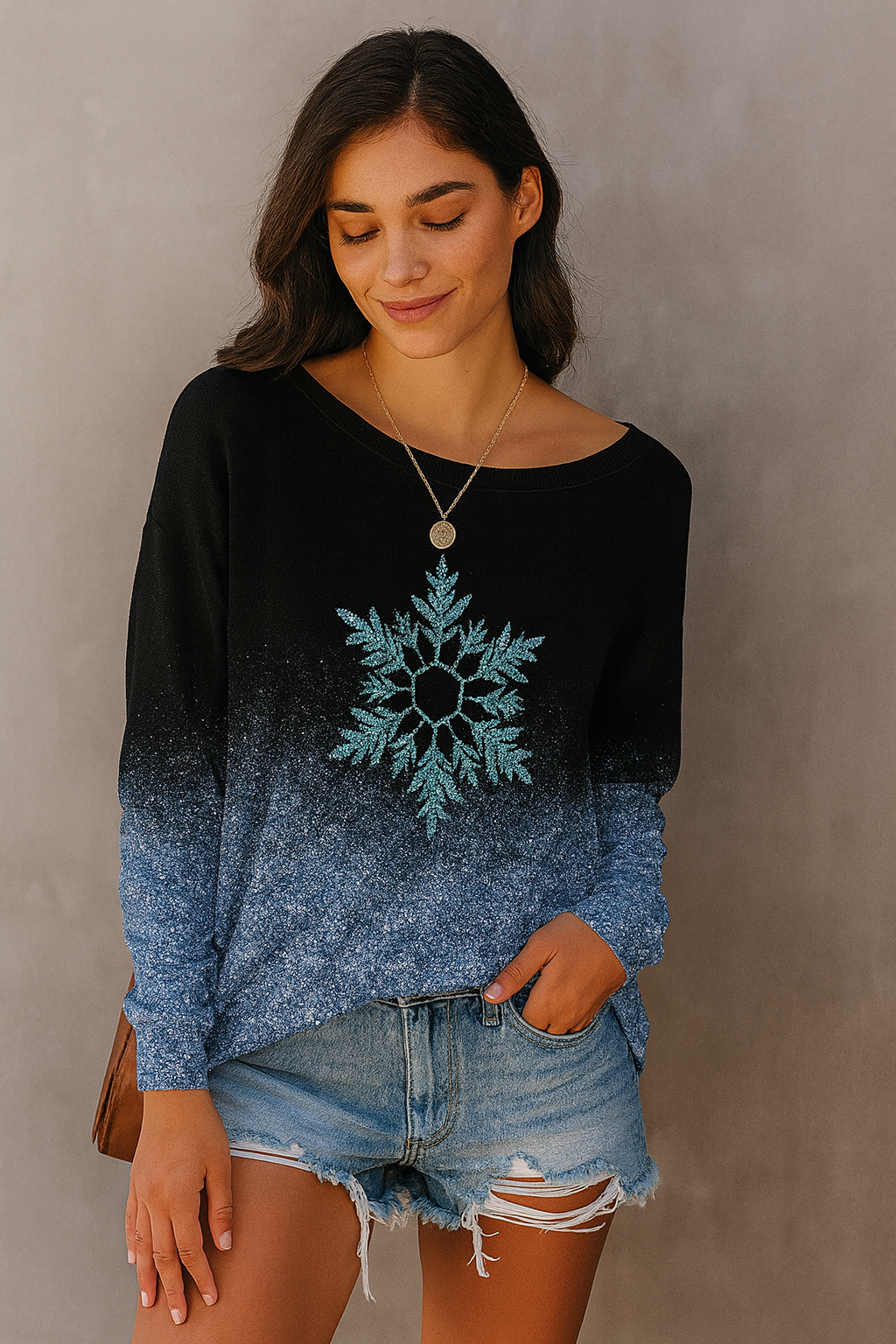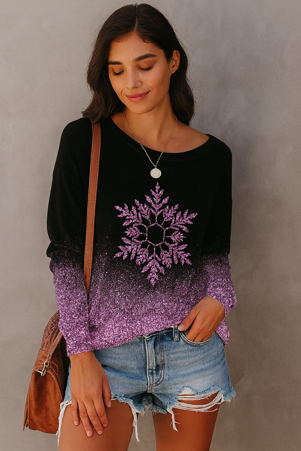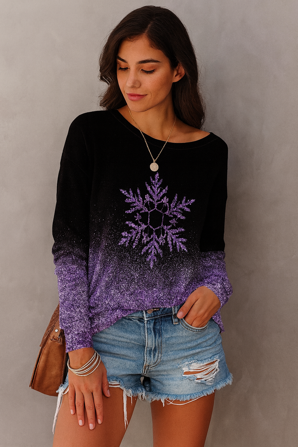 El Jersey Copo de Noche combina la magia del invierno con un diseño moderno y muy favorecedor. Su degradado en tonos negro y violeta crea un efecto visual elegante y actual, mientras que el copo de nieve central con acabado brillante aporta un toque especial que eleva cualquier look casual.