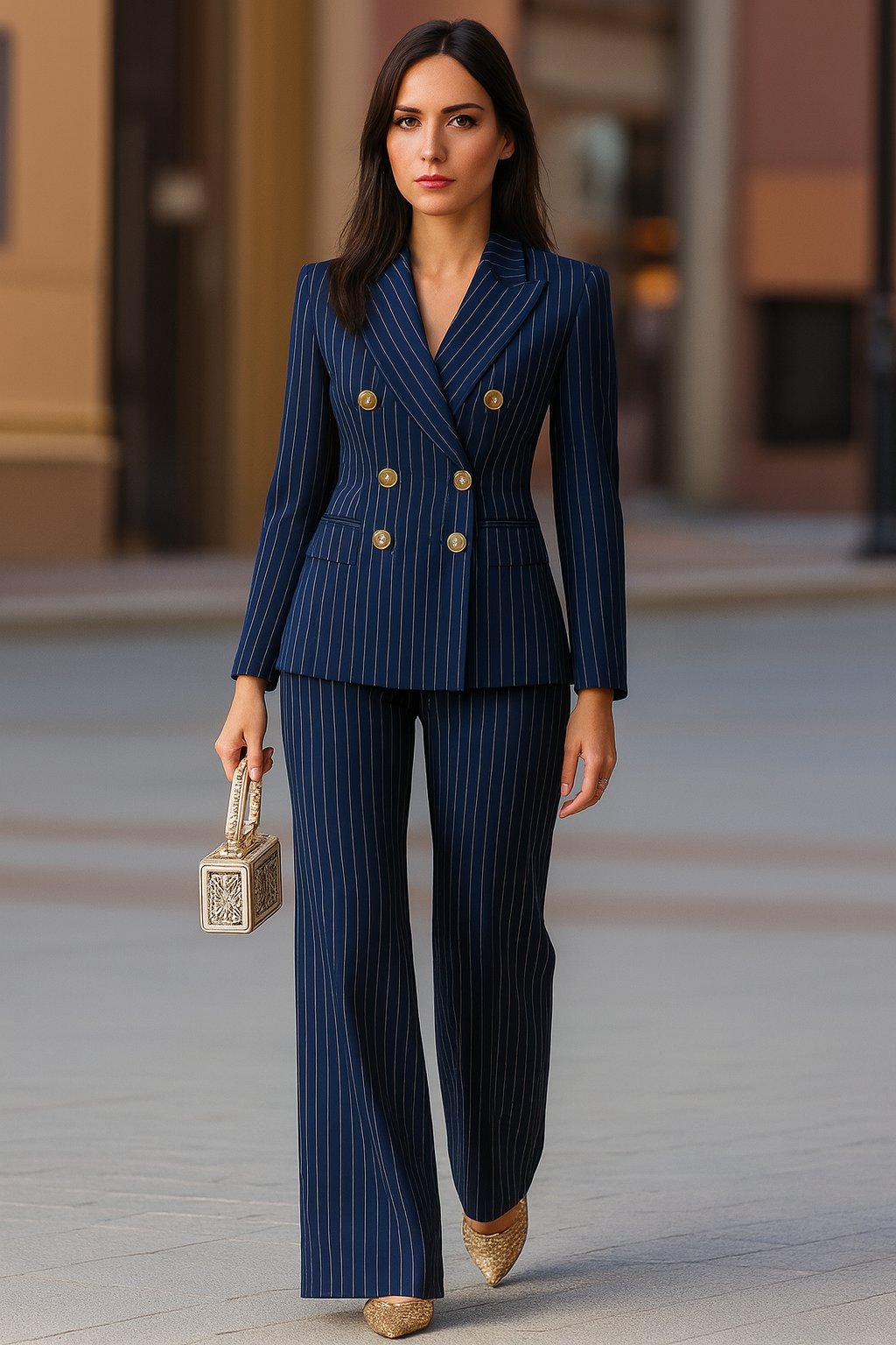 Potencia tu presencia con este traje sastre de mujer diseñado para transmitir elegancia y autoridad en cada paso. La chaqueta cruzada, con doble botonadura y hombros estructurados, define la silueta y crea un efecto estilizado que realza la figura de forma impecable. Sus rayas verticales afinan visualmente el cuerpo y aportan un aire sofisticado, ideal para destacar en reuniones, presentaciones o eventos especiales.
