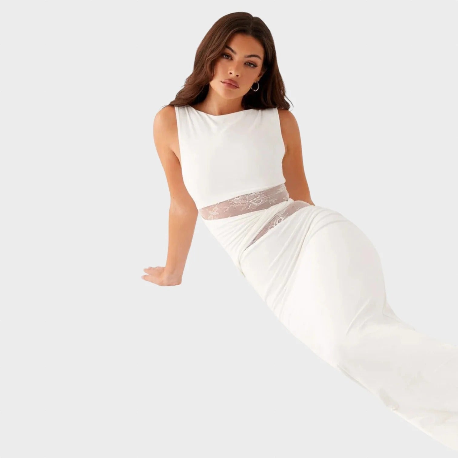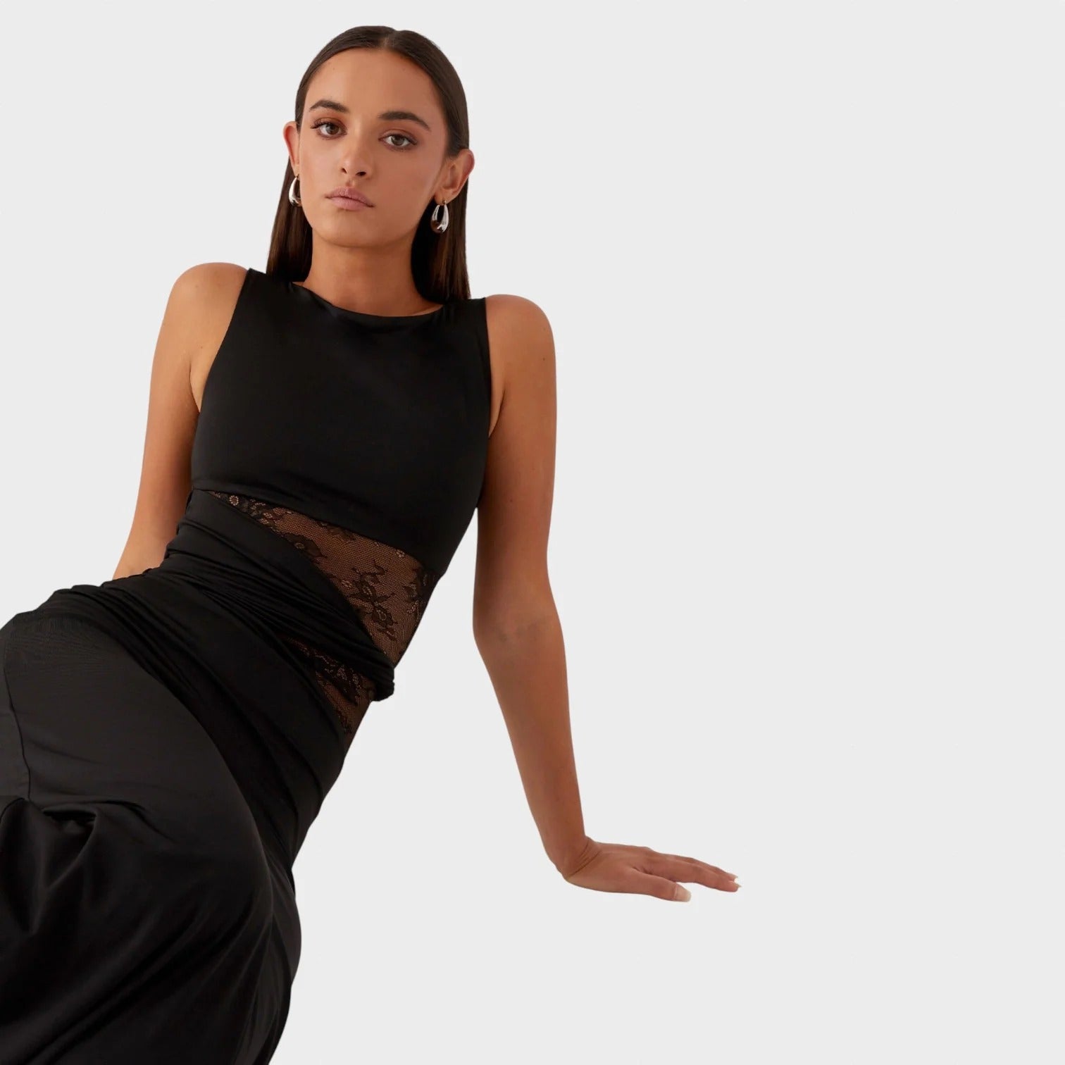 Su silueta larga y refinada se desliza sobre el cuerpo como un susurro, mientras que los paneles de encaje finamente trabajados revelan lo justo para despertar intriga, dibujando una cintura etérea que estiliza y realza tus curvas naturales.