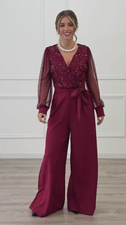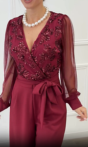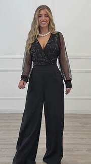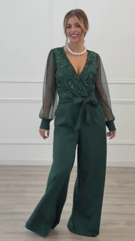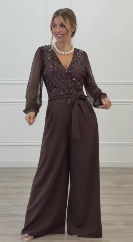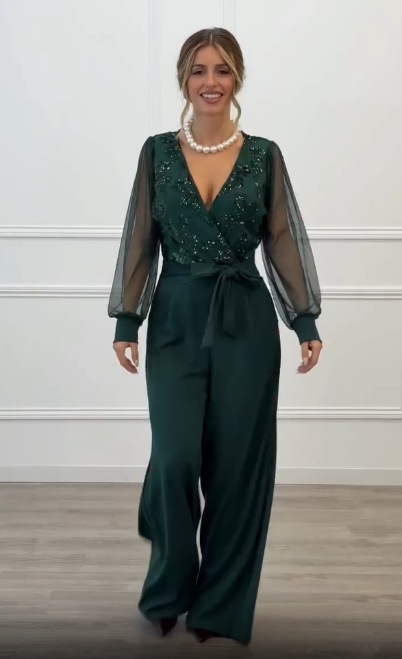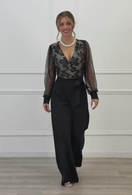 Las mangas largas de tejido semitransparente añaden ligereza y un toque romántico, equilibrando a la perfección el diseño. La cintura ajustable con lazada define la silueta de forma favorecedora, mientras que el pantalón de pierna ancha estiliza y alarga visualmente la figura, ofreciendo movimiento y comodidad.