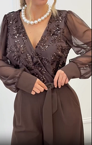 El Mono Luz de Gala es una prenda diseñada para deslumbrar con sofisticación y feminidad. Su escote cruzado en pico, delicadamente adornado con detalles brillantes, aporta un efecto luminoso y refinado que realza el torso con elegancia.