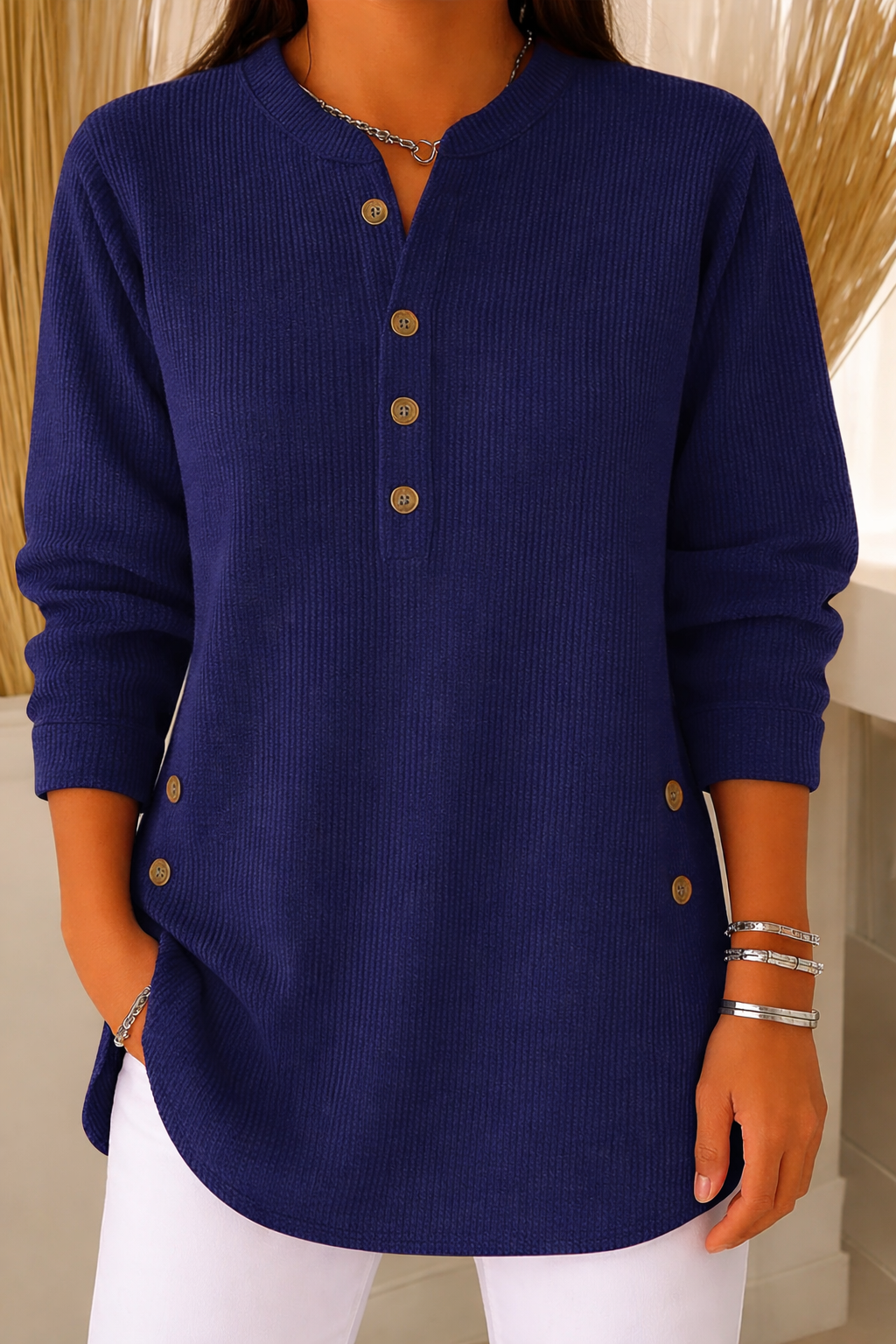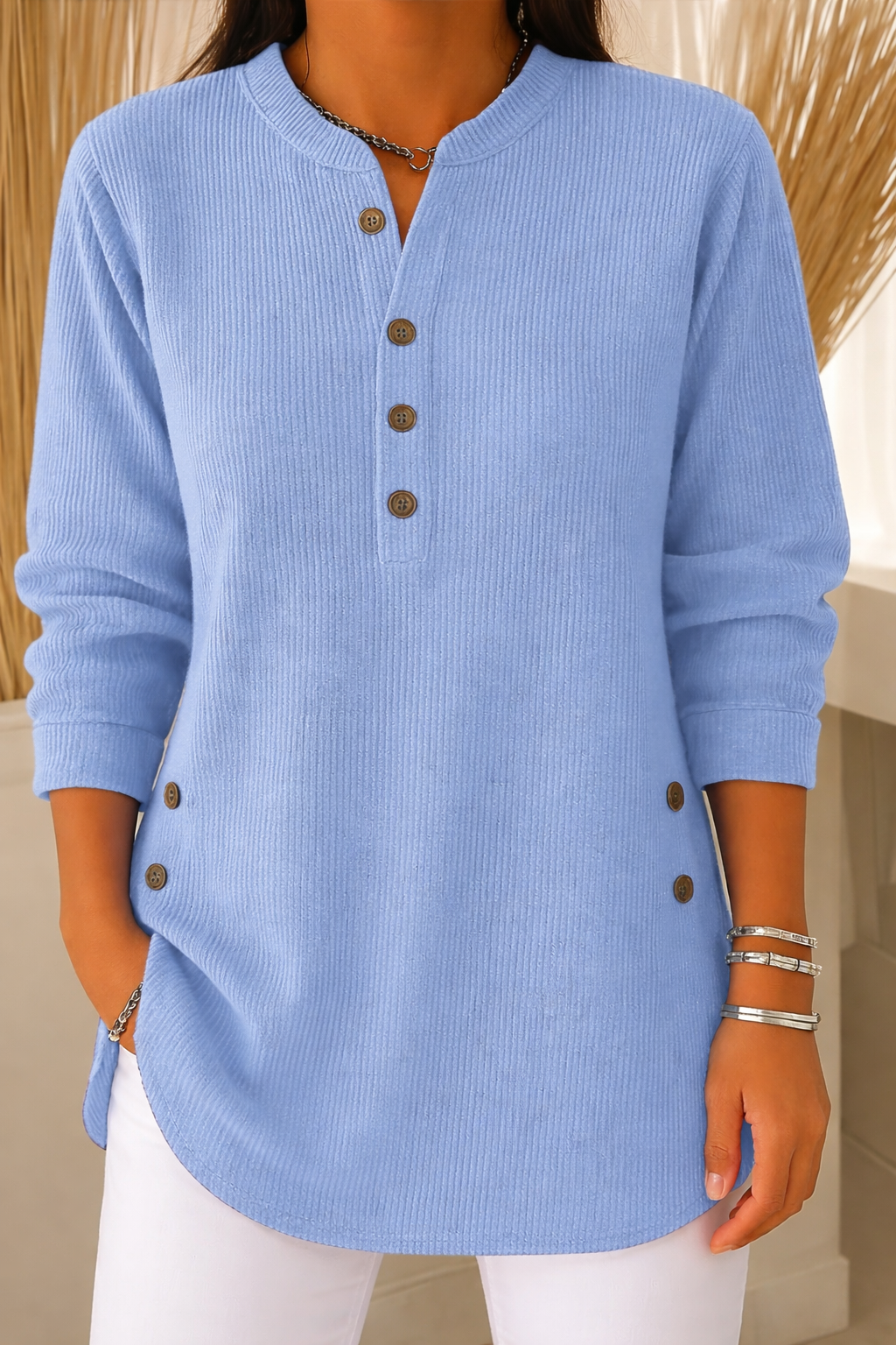 Prenda básica con un toque especial, diseñada para ofrecer comodidad y estilo en el día a día. Su tejido acanalado aporta textura y una caída favorecedora, mientras que el diseño de cuello redondo con abertura y botones decorativos añade un detalle distintivo y femenino. El corte recto y ligeramente holgado la convierte en una opción versátil, perfecta para combinar con pantalones, jeans o faldas, adaptándose tanto a looks casuales como a conjuntos más cuidados.