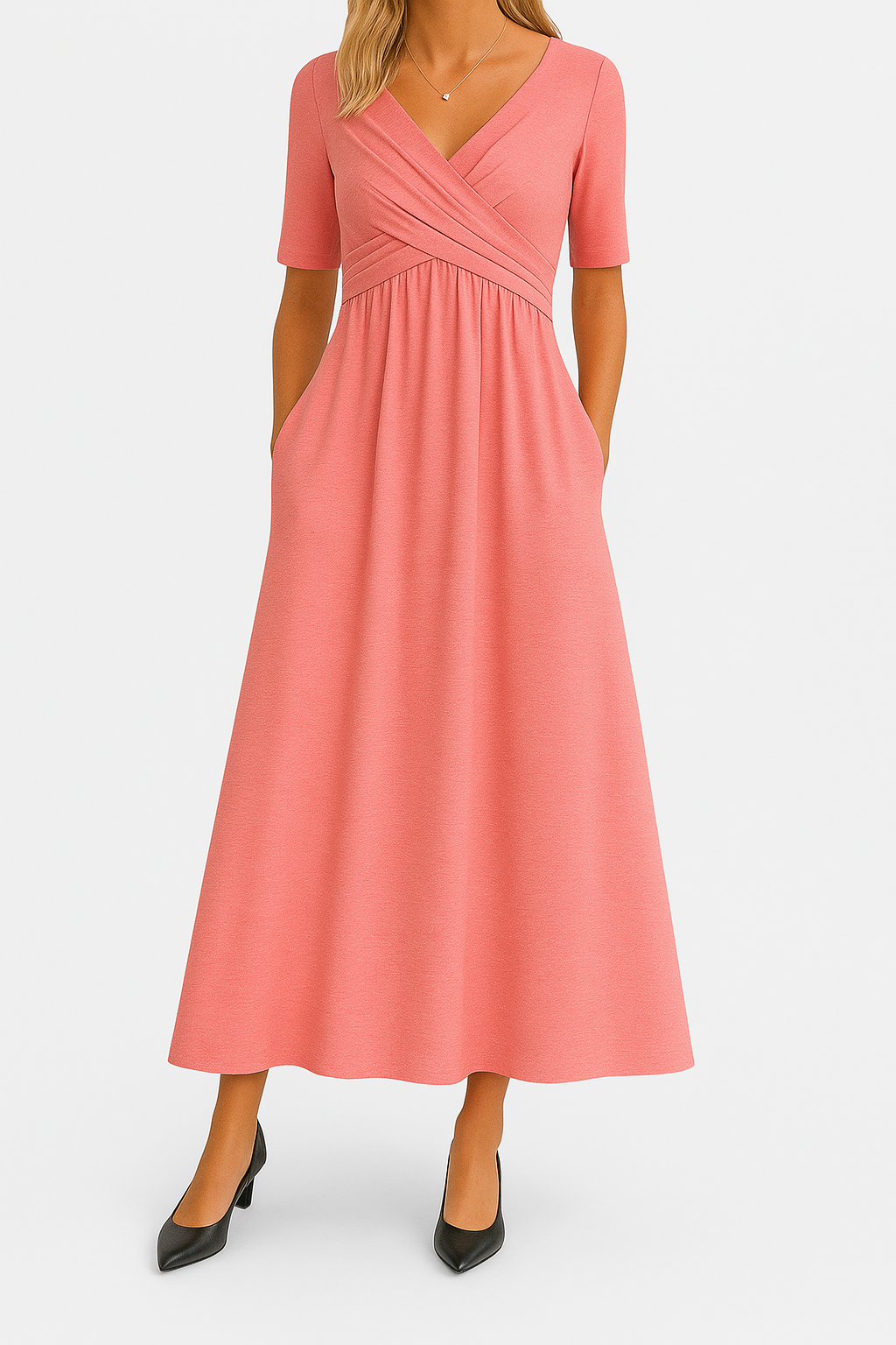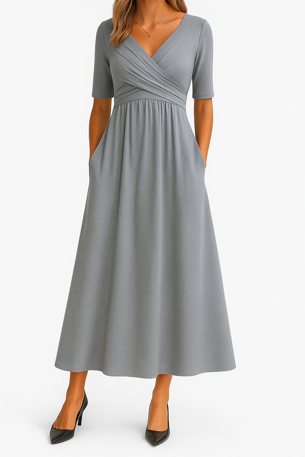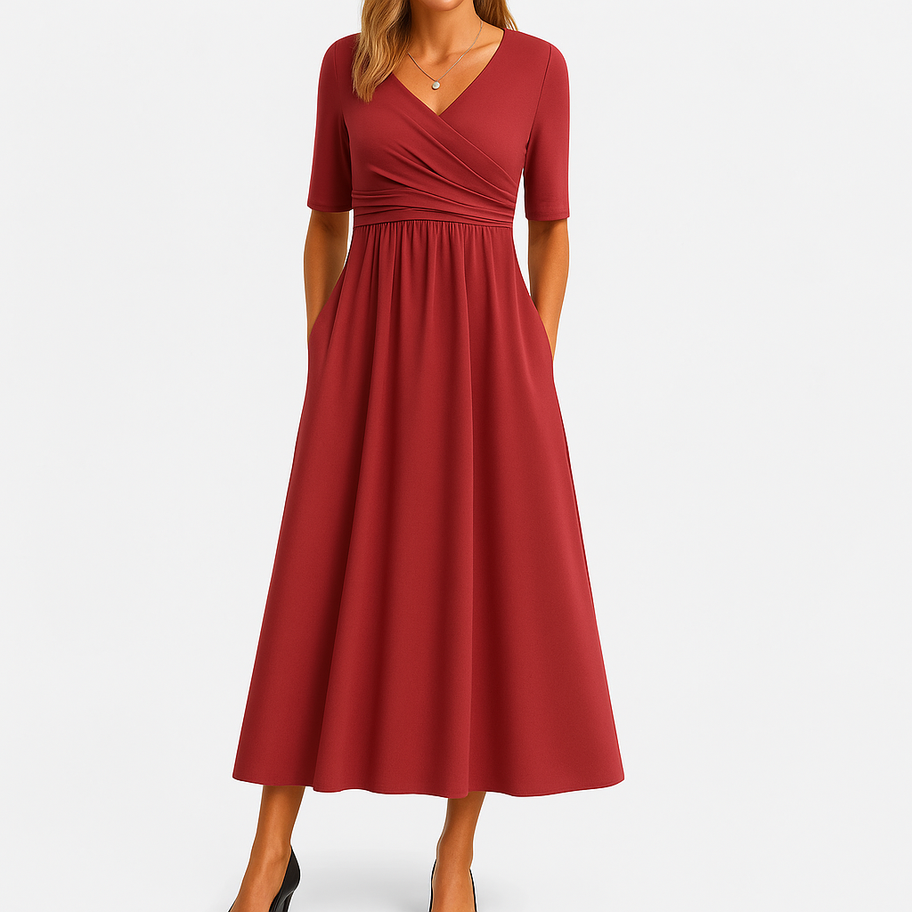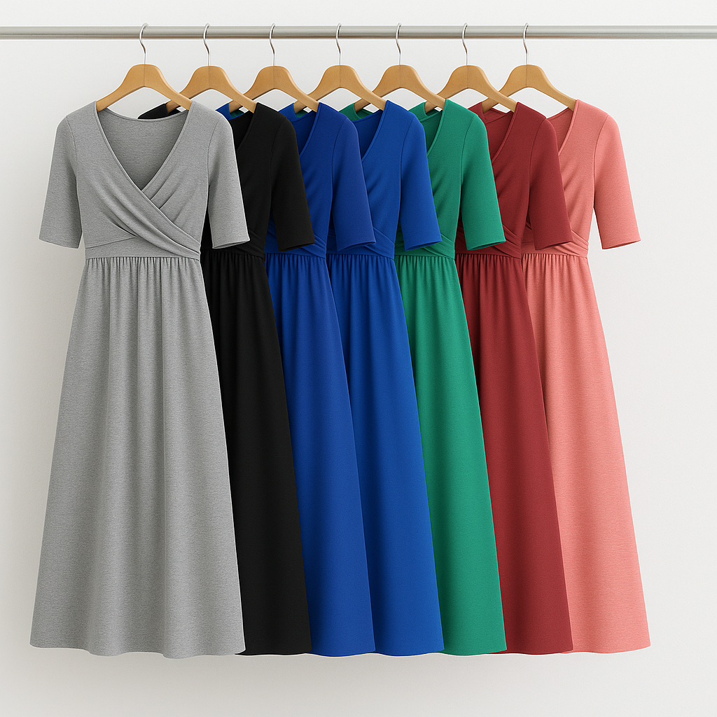 Un vestido que combina sofisticación, comodidad y versatilidad en una sola pieza. Su diseño cruzado envuelve la figura con suavidad, realzando la silueta de forma natural y elegante. La falda midi cae con un movimiento fluido que aporta ligereza y armonía a cada paso.