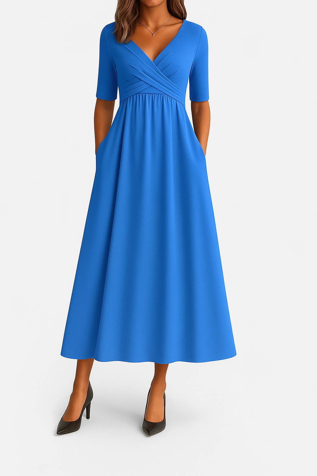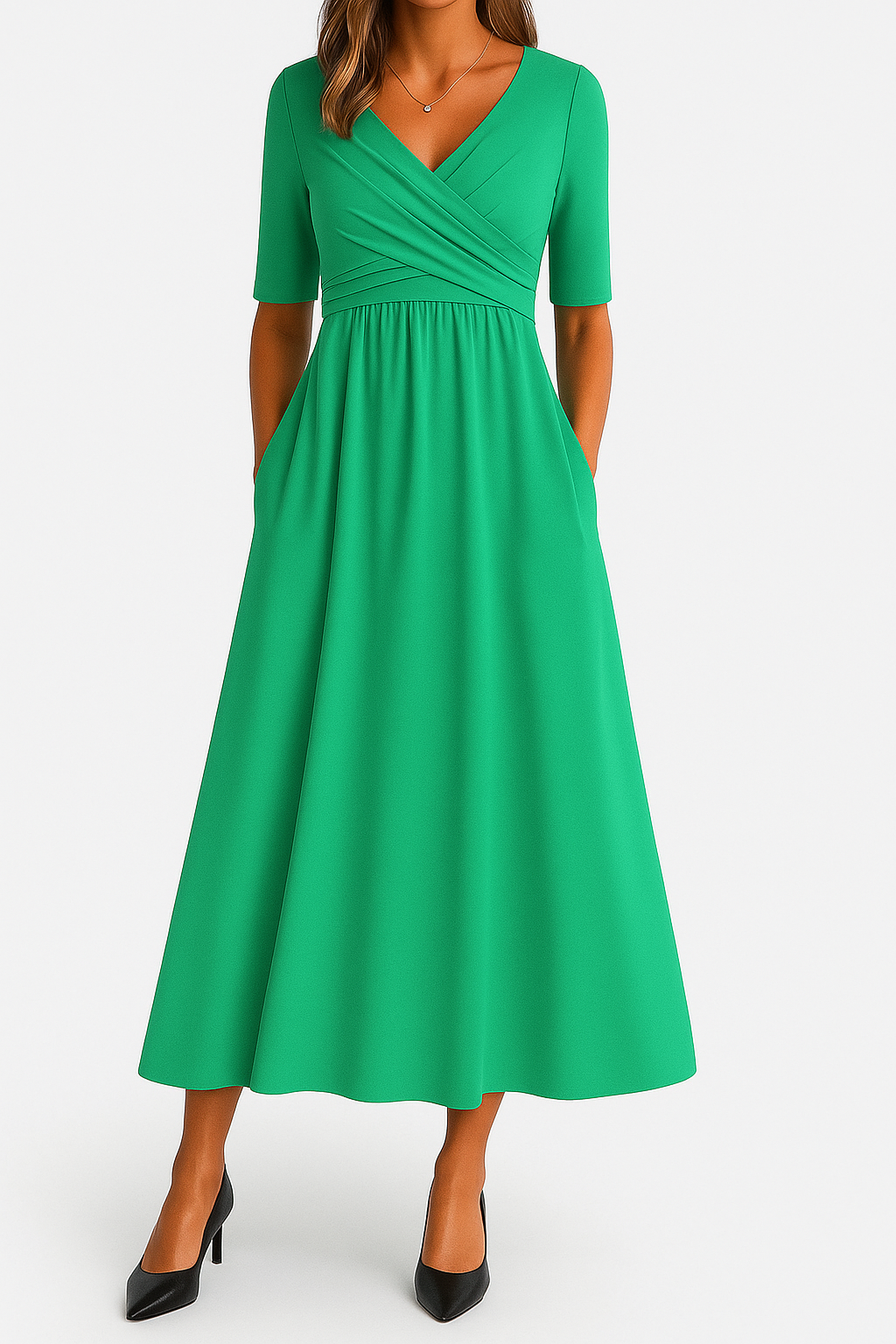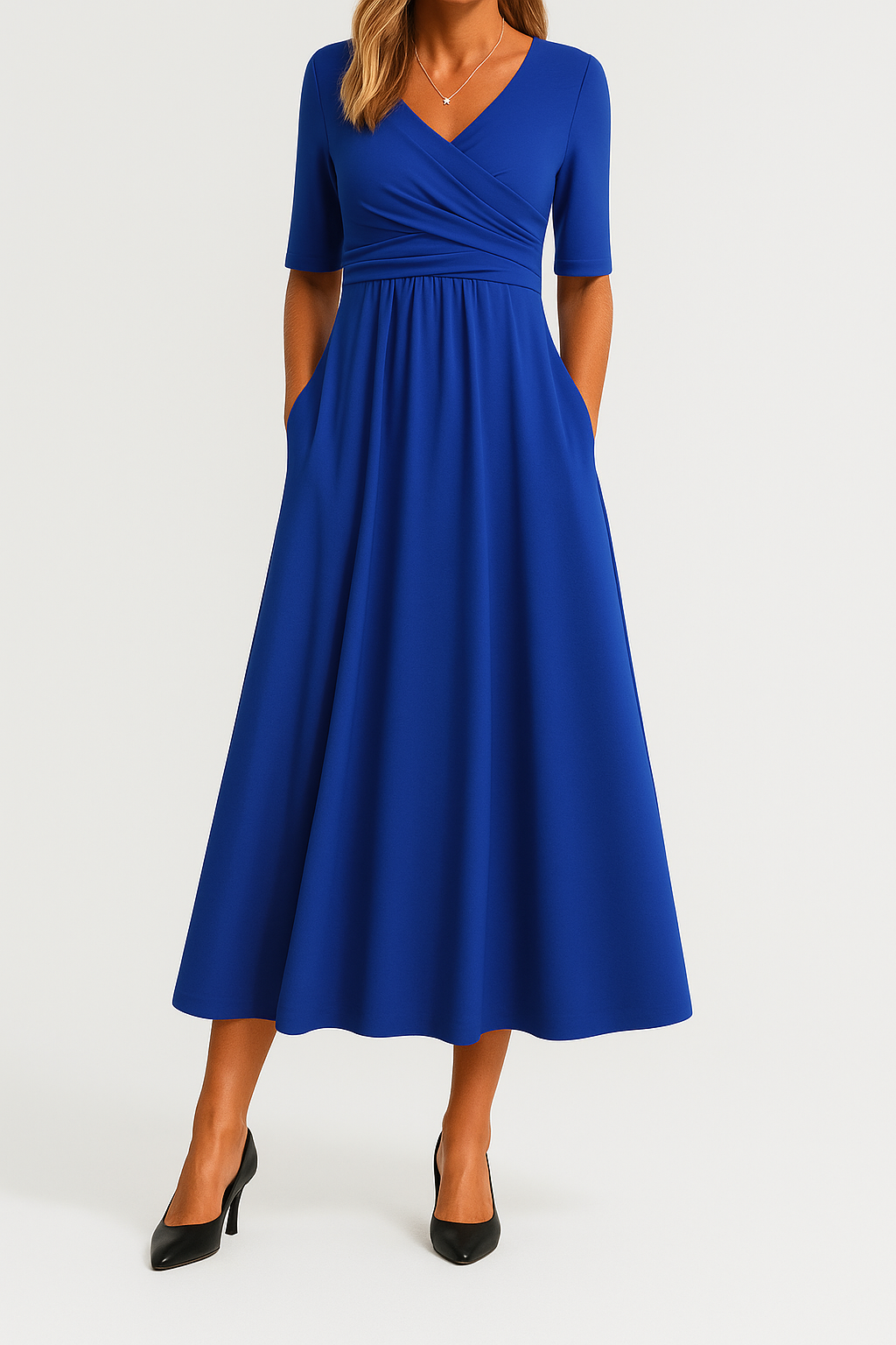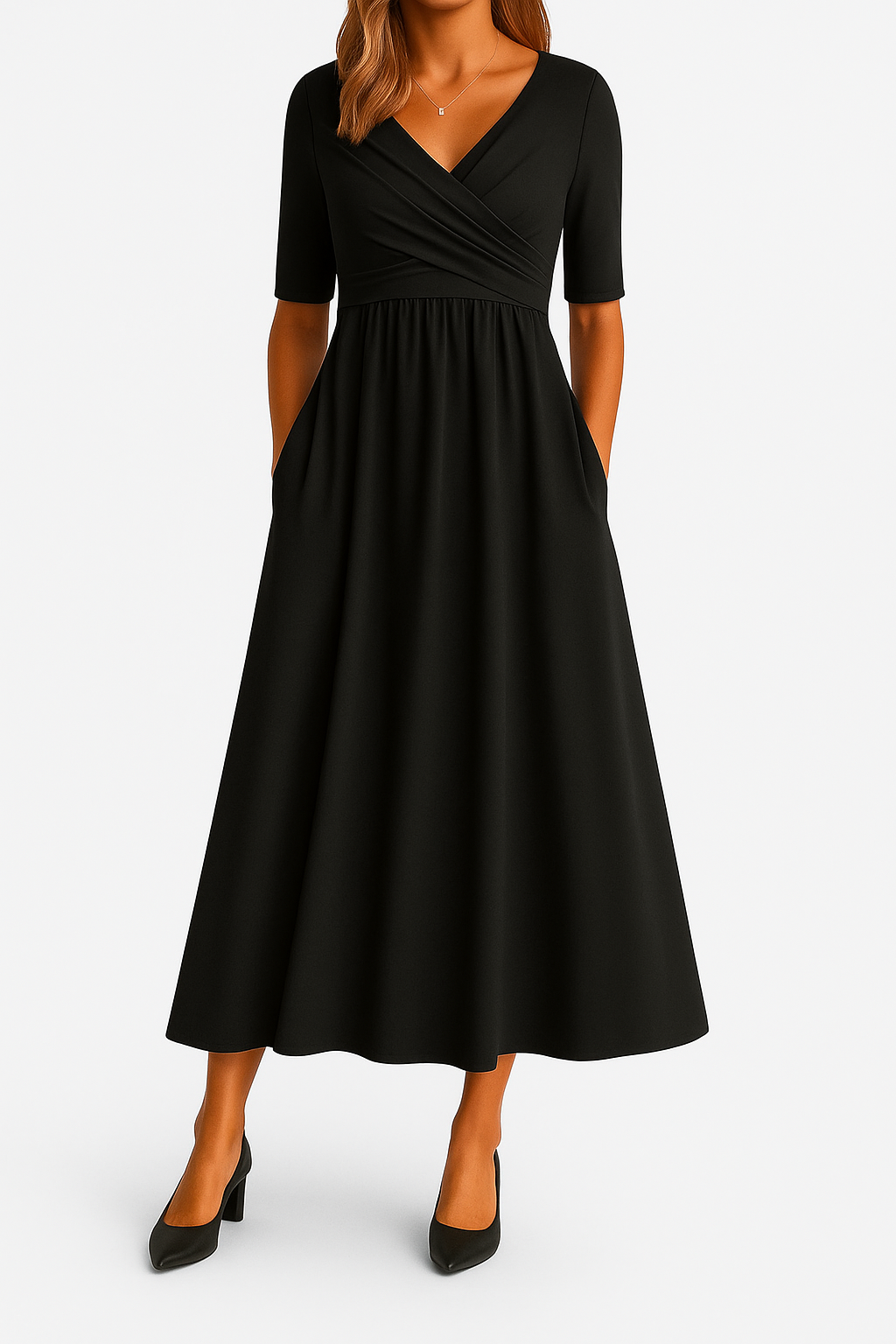 Un vestido que combina sofisticación, comodidad y versatilidad en una sola pieza. Su diseño cruzado envuelve la figura con suavidad, realzando la silueta de forma natural y elegante. La falda midi cae con un movimiento fluido que aporta ligereza y armonía a cada paso.
